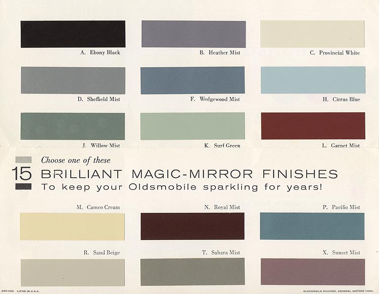 We have no memo of the notification of Chariot Red replacing Heather Mist (althought we do have an Oldsmobile supplied Trim Combination chart that looks like it might have been attached to a memo), but this apparently took place in late October or early November. We do have a Ditzler Paint bulletin, dated October 27th, showing Heather Mist (code B) as being discontinued, and Chariot Red (code V) as an additional color. We also have a "2nd revision" Trim Combination chart, dated October, 1961 showing this change (as well as the previously promised Royal Mist wheel cover change). At this time, Chariot Red color chips were sent to dealers for insertion into their Color and Fabric Selectors. Some dealers removed their Heather Mist color chips. Anyone with an Oldsmobile bulletin reflecting this Heather Mist to Chariot Red change is asked to step forward by contacting us here.