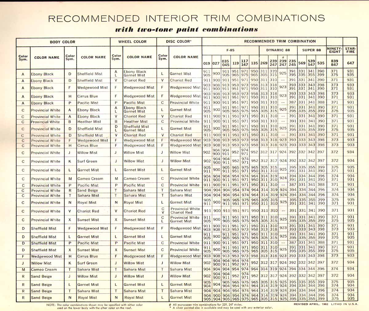 Below is a Recommended Trim Combinations Chart from April, 1962. It shows recommended two tone combinations, recommended interior and paint combinations, and recommended wheel disc and paint combinations. Of course, is a customer had a hefty deposit, anything was available!