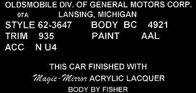 The first type are the one or two digit codes shown in the example. These are the option codes that the dealer used when placing the car order. For a complete list of dealer option codes, follow the Accessories links. Use the codes listed there to decode your accessory codes. There are a few codes that you may find on your Data Plate that you will not find in the accessories list. Cars equipped with the standard 3-speed Synchromesh transmission will have the code "SM" on the Data Plate. We have also seen "SMT" and "SYNCHRO". These codes told Fisher Body to set the body up for standard shift. Since the majority of Oldsmobiles were equipped with 4-S Hydra-Matic the lack of the SM code was a default to set the body up for automatic transmission. Some cars also show an "S" as the first code. This is not a code for dual exhaust. Dual exhaust would not have affected the build of the body. At this time it is assumed that the "S" stands for Sold Order.