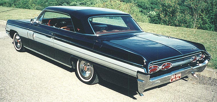 Mike Cibulas of North Canton, Ohio is the owner of this Ebony Black '62 Starfire Coupe. He's owned it since 1996. It was originally a California car. Mike's early childhood memories include his Dad's Willow Mist '62 Starfire Coupe (a color not often seen on Starfires), purchased used in August of '63 (VIN #626M06848 - if you happen to know of it's whereabouts, please contact Mike). Photos are courtesy of Mike and were shot at the 1999 National Antique Oldsmobile Club National Meet held at Oglebay Park, Wheeling, West Virginia. Mike has the distinct honor of being our first Rocket Circle member.