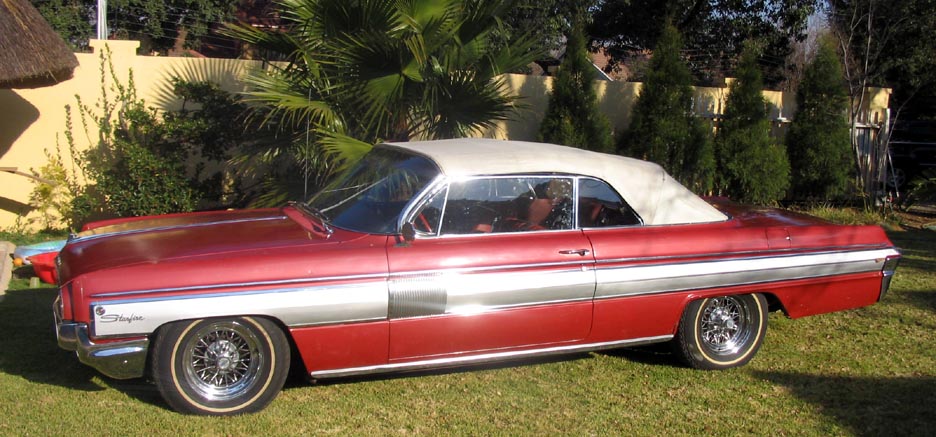 Sean Geldenhuys, of Johannessburg, South Africa is the owner of this Garnet Mist '62 Starfire convertible. Sean says it has 100k miles and is 100% original. It was stored in a garage for 15 years. Notice the side marker lamps that have been installed. Wire wheels are not stock.