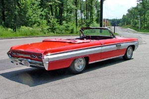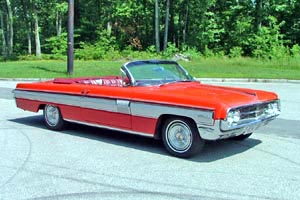 Ted Loranz, of Medway, Massachusetts is the owner of this Chariot Red '62 Starfire convertible. Ted talked an eBay seller into ending the auction early and purchased the car in June of '04. The car underwent a partial restoration which included paint, interior, and a new top in the early 1990s. It is equipped with Power Ventipanes, Power Antenna, Safety Sentinel and Super DeLuxe Wonderbar radio, among other items. Visit Ted's Oldsmobile Page, complete with a '62 Starfire commercial - click the first red convertible, then click the second red convertible to see the commercial.