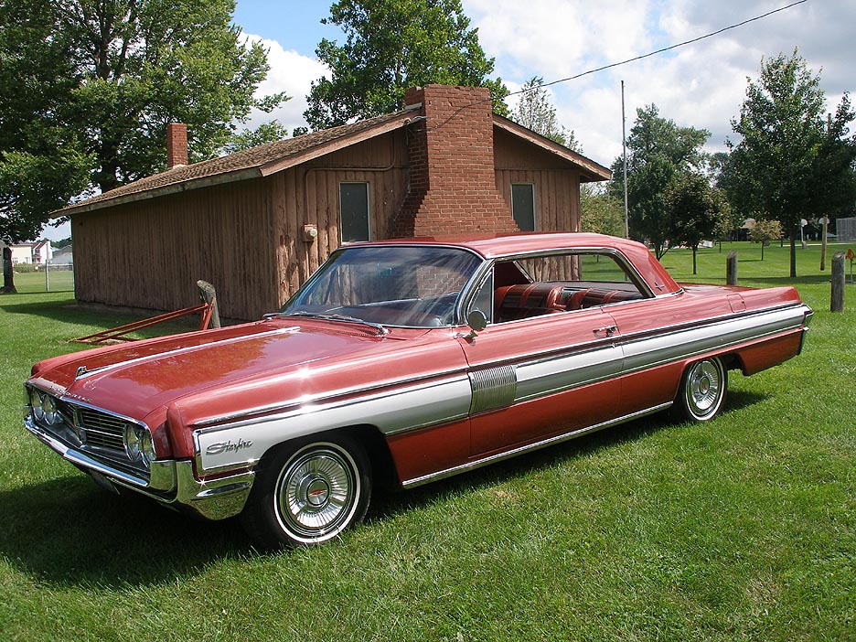 John & Jenny Wiman, of Tolono, Illinois have owned this Garnet Mist '62 Starfire coupe since 2005. It is nearly identical to the car John's father owned from 1962 to 1969. John's dad had dog dish hubcaps installed on his car because of the difficulty to check air pressure with the deluxe covers!! Don't we all know about that? This car wears Provincial White spinners. Built in Kansas City, it is also equipped with power trunk release, rear defogger, power antenna and Safety Sentinel.
