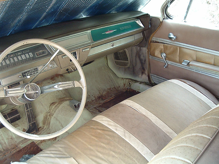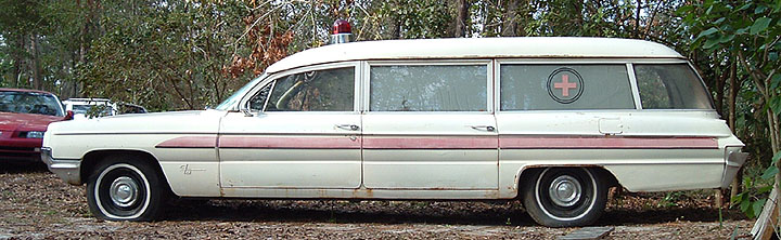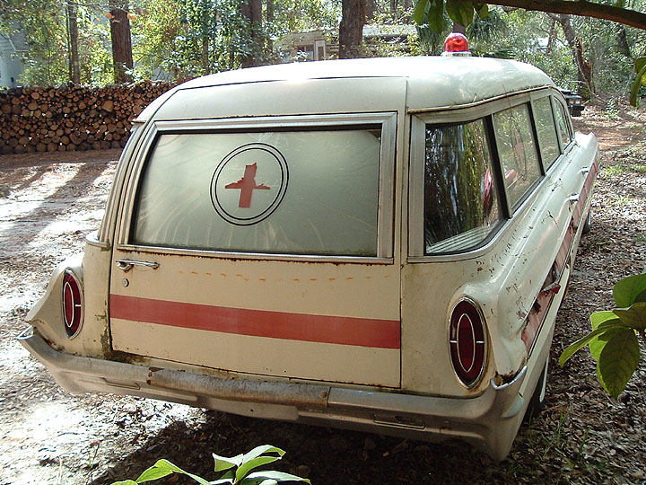 Paul Woodworth, of Port Orange, Florida is the owner of this rare Cotner/Bevington Cotington Ambulance. It started life as a Dynamic 88 Holiday Coupe. We'd like to say it is Provincial White, but it's data plate says PRIME where the paint code belongs. It sports a Fawn interior, though the door panels and seat inserts were replaced with a star-patterned cloth by C/B. Note the radio and clock delete plates on the dash, along with the toggle switches for siren, beacon light and back-up lights. See this can in action in the movie "Digging to China" starring Kevin Bacon.